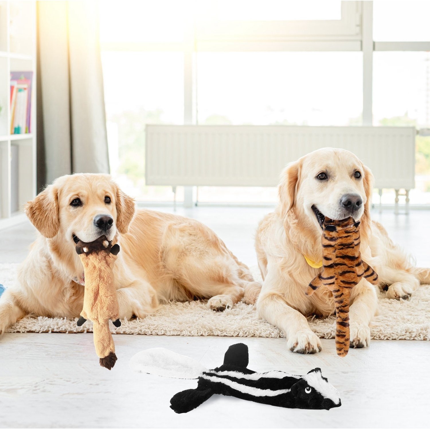 *5Pcs Different Plush Toys For Dogs*:A combination of 5pcs different appearances cute animal:grey raccoon,yellow & black tiger,black & white skunk,yellow lion,and brown fox,these perfect plush toys can bring endless fun and help your furry friends get rid of bad mood. Suitable for small,medium and large dogs.