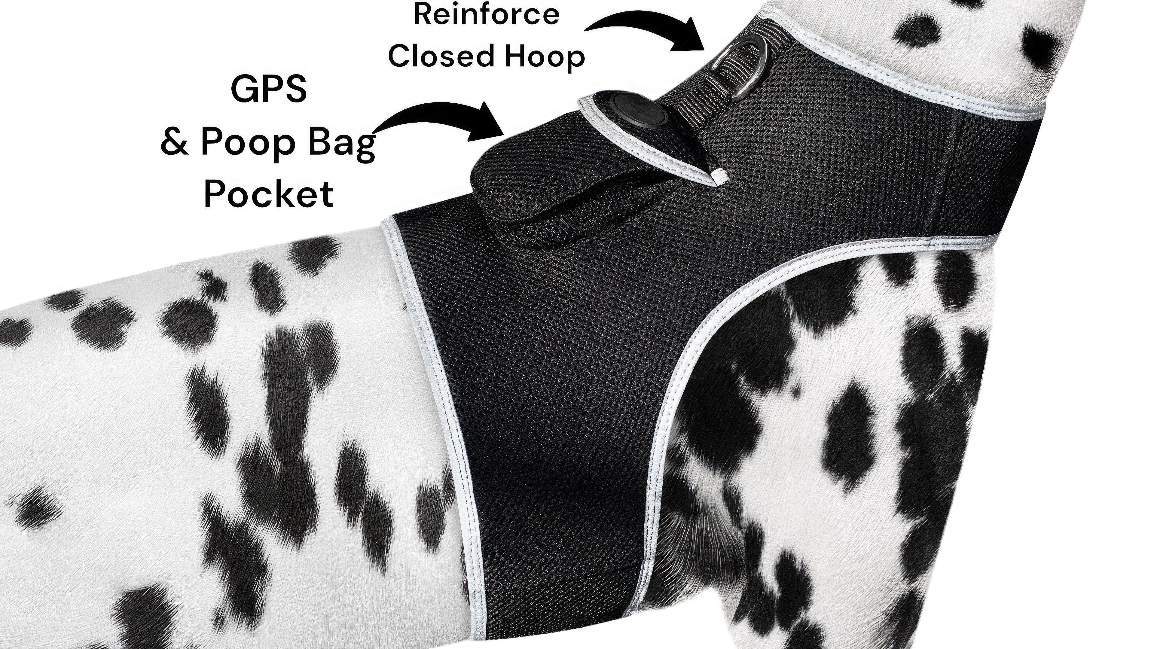 2.Premium mesh breathable body harness with pocket designed for your pets comfort first, and tracking second, comfortable for your pets with six sizes available and fully adjustable.