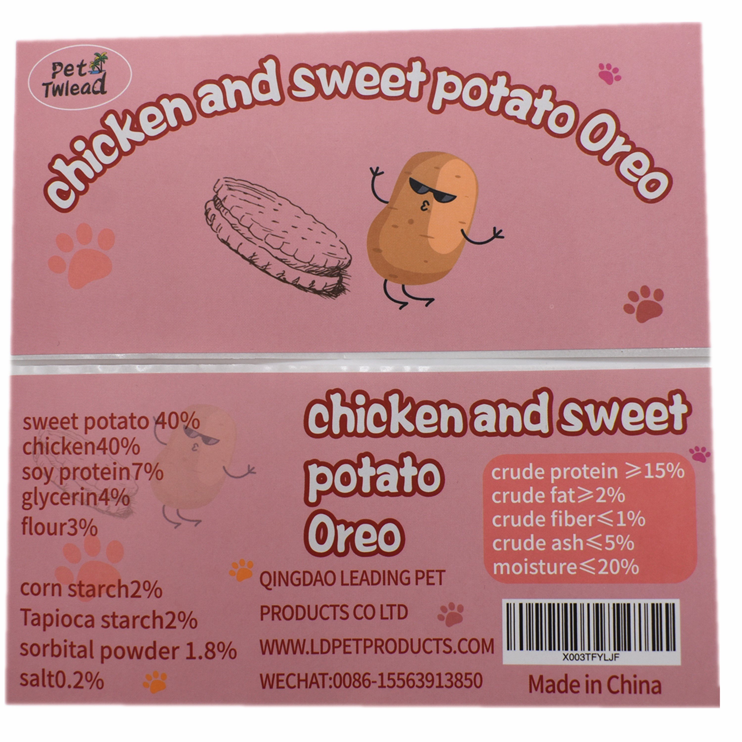 Pet snack is very popular among dogs. Dog treats can be used as a training prop for dogs, but also can enhance the bond between dogs and owners. Dog snacks is a very good food.Composition: sweet potato 40% chicken40% soy protein7% glycerin4% flour3% corn starch2% Tapioca starch2% sorbital powder 1.8% salt0.2%