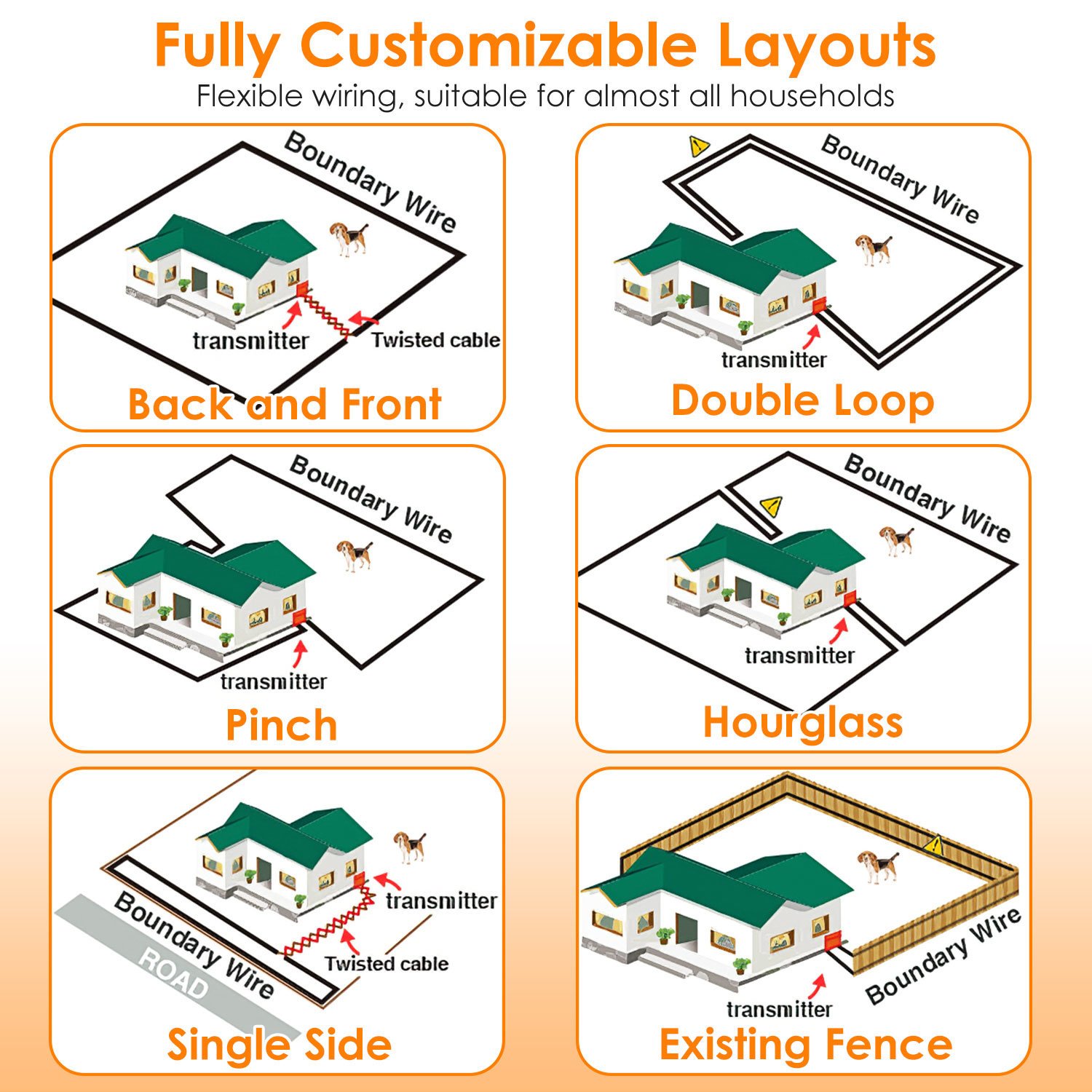 *Efficient Dog Fencing System*:The transmitter,receiver and boundary wire forms an effective fencing system together to deter our dogs from the designated area,which greatly ensures our pets’ safety. The boundary wire creates an effective signal field when the transmitter is working. If your dog tends to walk out of the boundary,the transmitter will emit a harmless radio signal. Once the signal is detected by the receiver,it will automatically start warning beep,vibration or static shock to urge your dog to go back into the boundary.