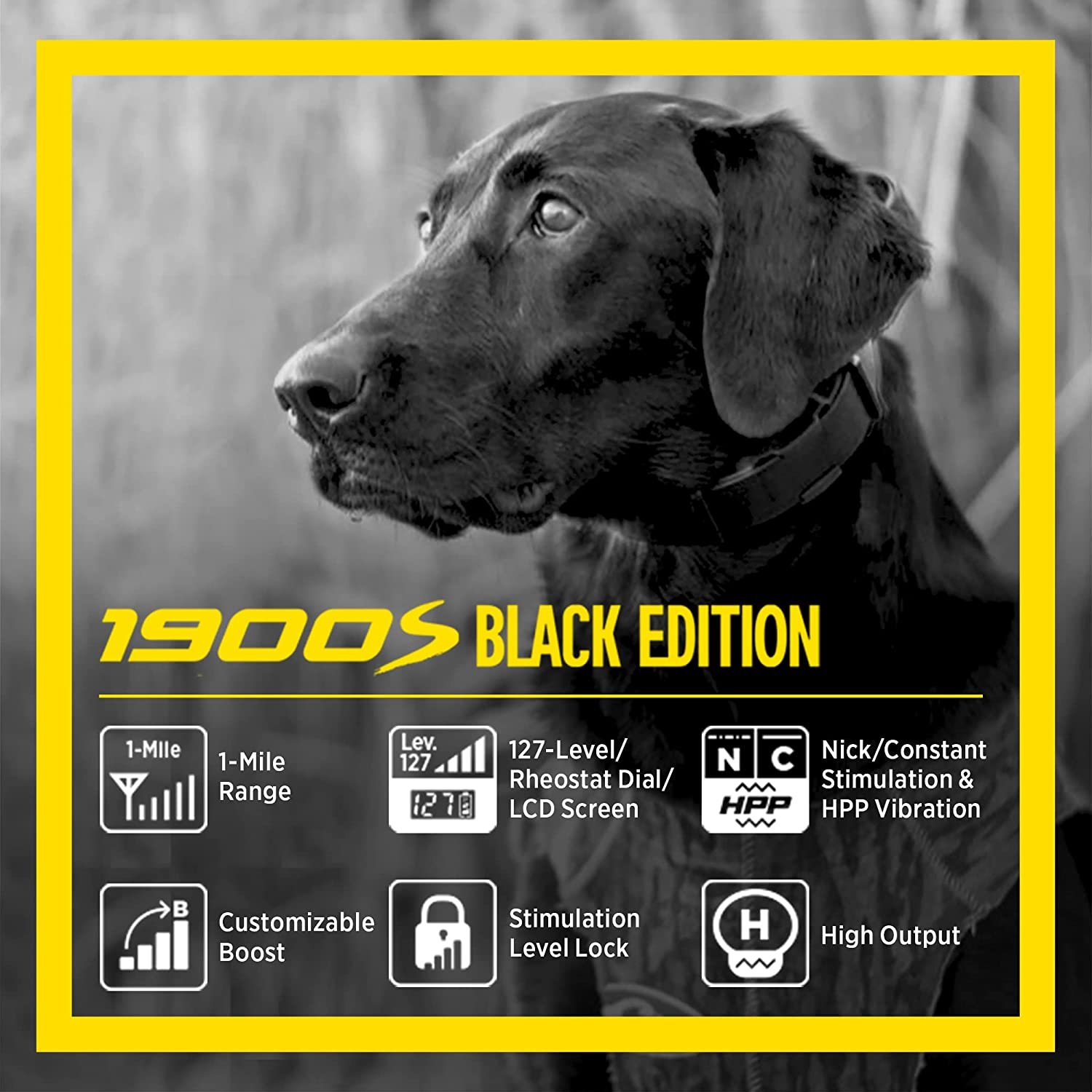 • BOOST & LOCK FEATURES: Enhance your training experience with the superior Boost button. The constant correction with a customizable Boost button allows for instant level increases to immediately recall you dog. Go from training mode to obedience mode easily by setting your own custom Boost to jump to your enhanced training level seamlessly. The newly introduced Safety Level Lock prevents unwanted or accidental level changes. 1-MILE RANGE: The range of this training e-collar is perfect for simple to complex training commands for your dog. The 1900S BLACK is a 1-mile, single-dog version of our bestselling 1900S e-collar is perfect for serious obedience, hunting, and K-9 training.
