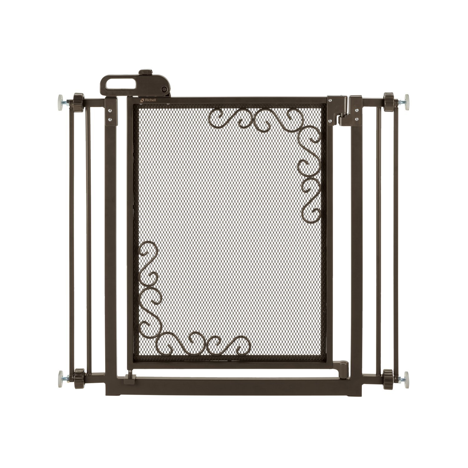 Crafted of durable metal and featuring an exquisite mesh screen, our One-Touch Metal Mesh Pet Gate has a new luxurious look! The tension-mount gate design stays firmly in place without damaging wall surfaces. The single button, easy lifting door handle allows for the smooth opening of the mesh door in either direction with just one hand. Easily carry items in one hand while opening the gate with the other. Add both ease of use and style to your home décor with the Richell One Touch Metal Mesh Gate. This functional work of art comes in either Black or Antique Bronze.