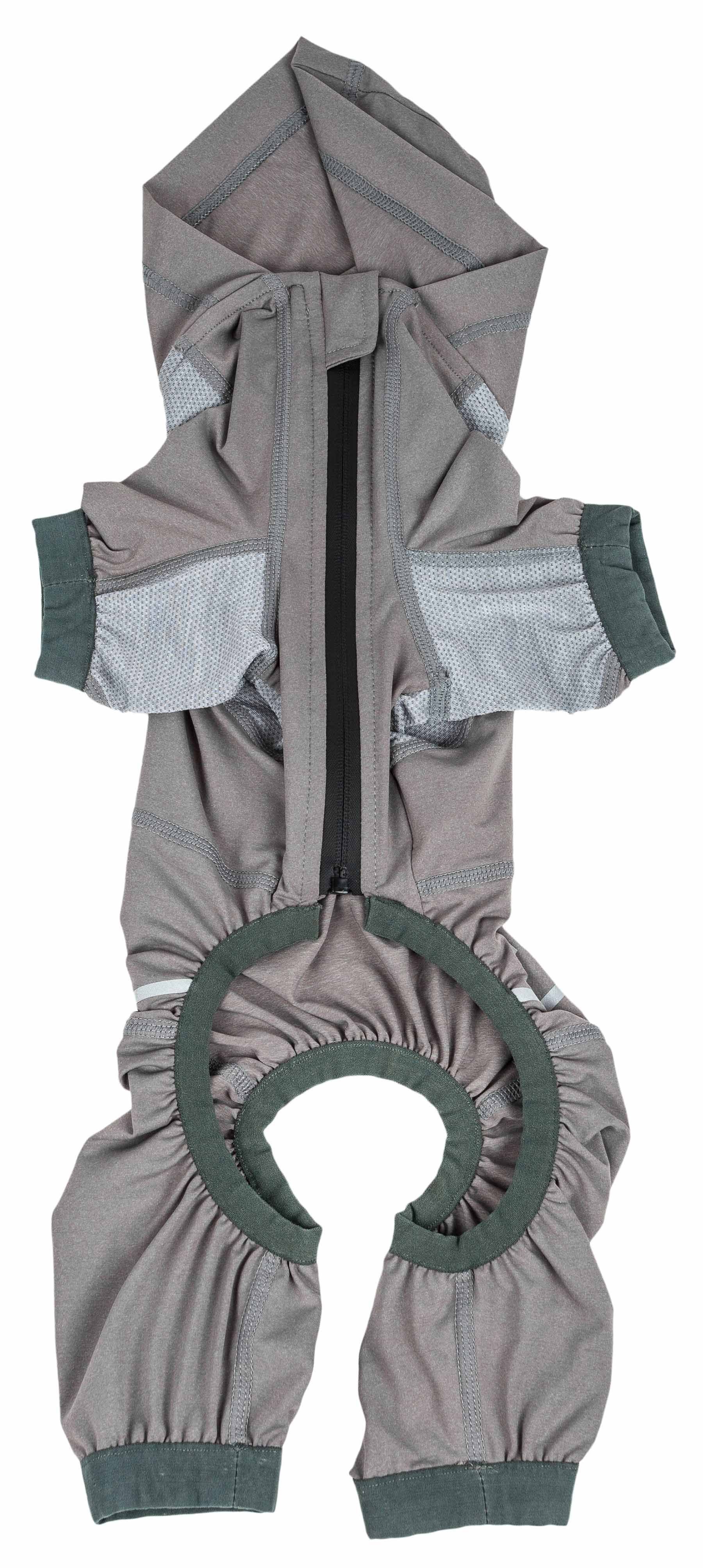 4.Seamless construction with conformed fitted elasticity around the body and sleeves for a more customizable fit, with added perforated Stretchy Mesh-Panels along the arms for Strategic Ventilation and Flexibility with Waterproof Zippered Construction and a Leash Slit along the back.