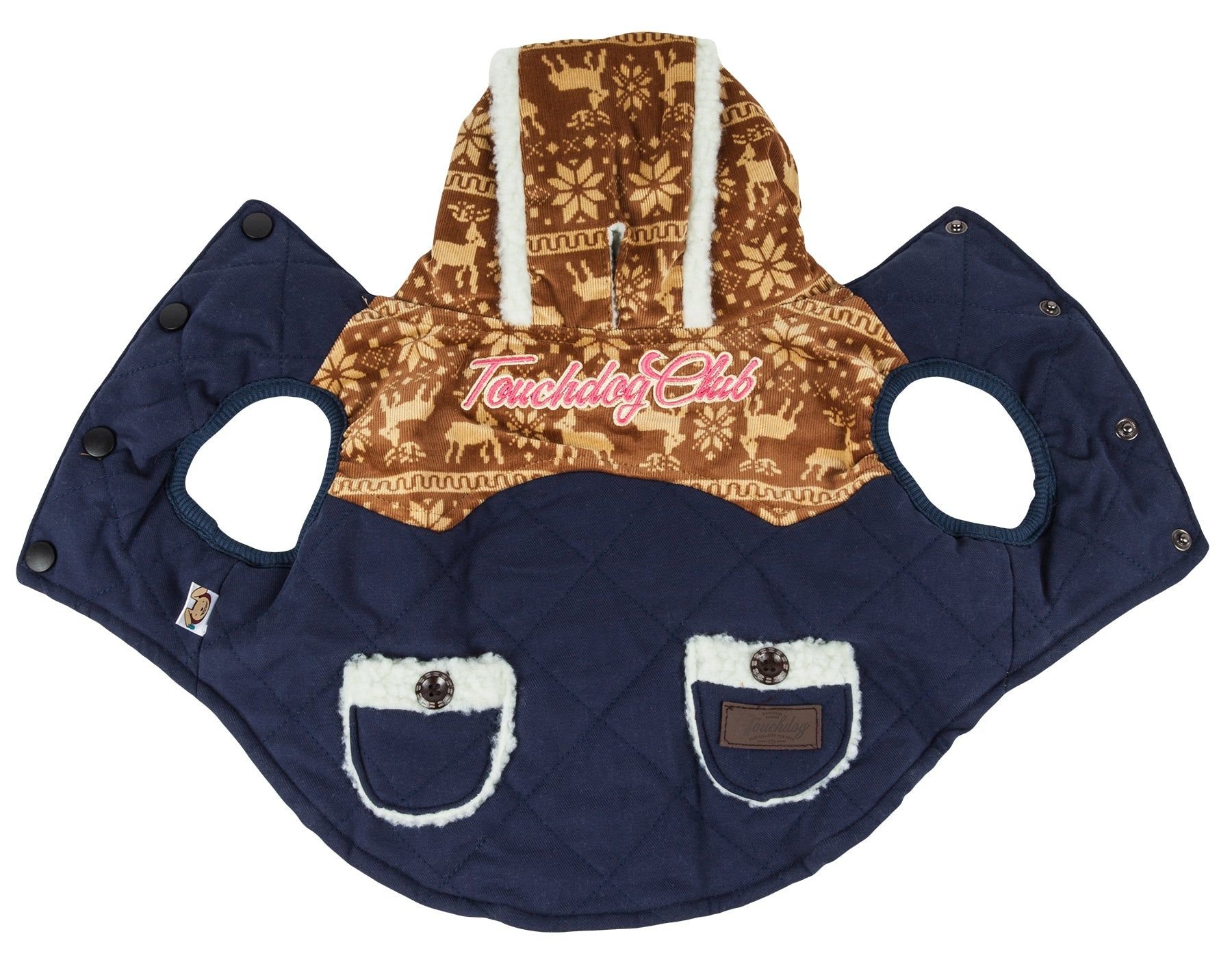 The Touchdog Snowadayz Pom-Pom Hooded Sweater Features a trendy Box-Stitched Polyester and Polar Fleece Reindeer Patterned Outershell with Outer Sherpa Lining and accented Adjustable Hooded Pom-Poms. Features an accented Outer-Lined buttoned Back Pockets and Trims with stitching. Additionally, this cool Dog Hoodie features a Leash Slit by the bottom portion of the hood and backside with the Touchdog embroidered tradestamp of perfection on the back-side. Available in Multiple Colors and Sizes. Sizing Guide: From Back of Neck to Tail area ("In" Inches)