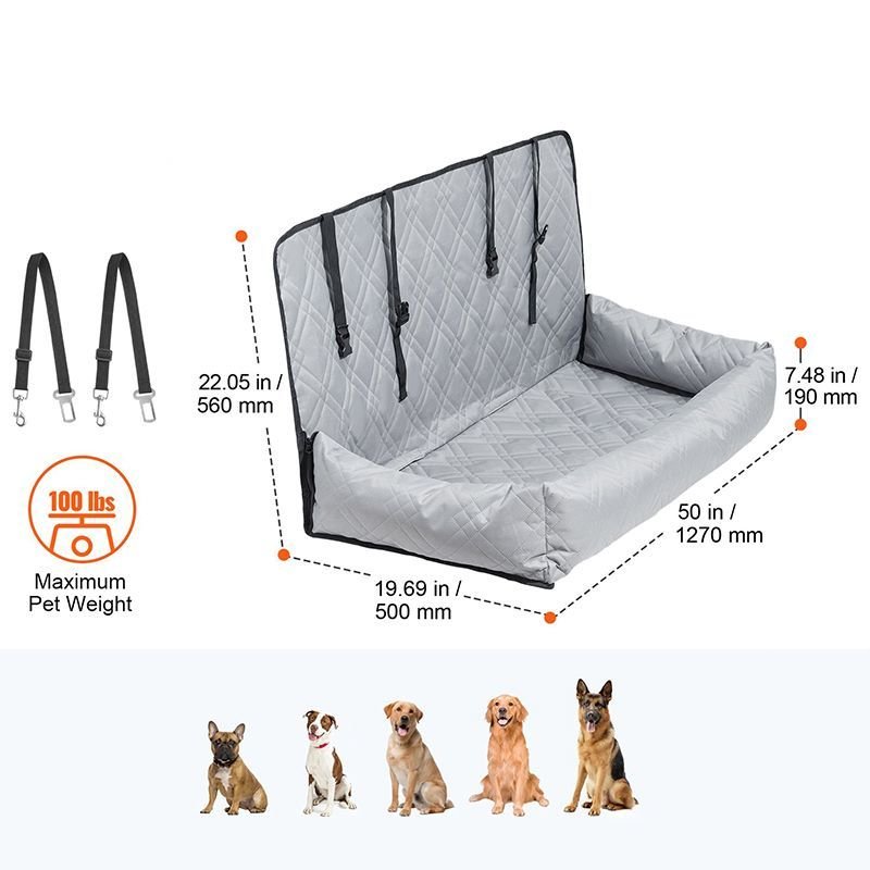 Features adjustable seat belts and a pet safety strap for secure attachment.