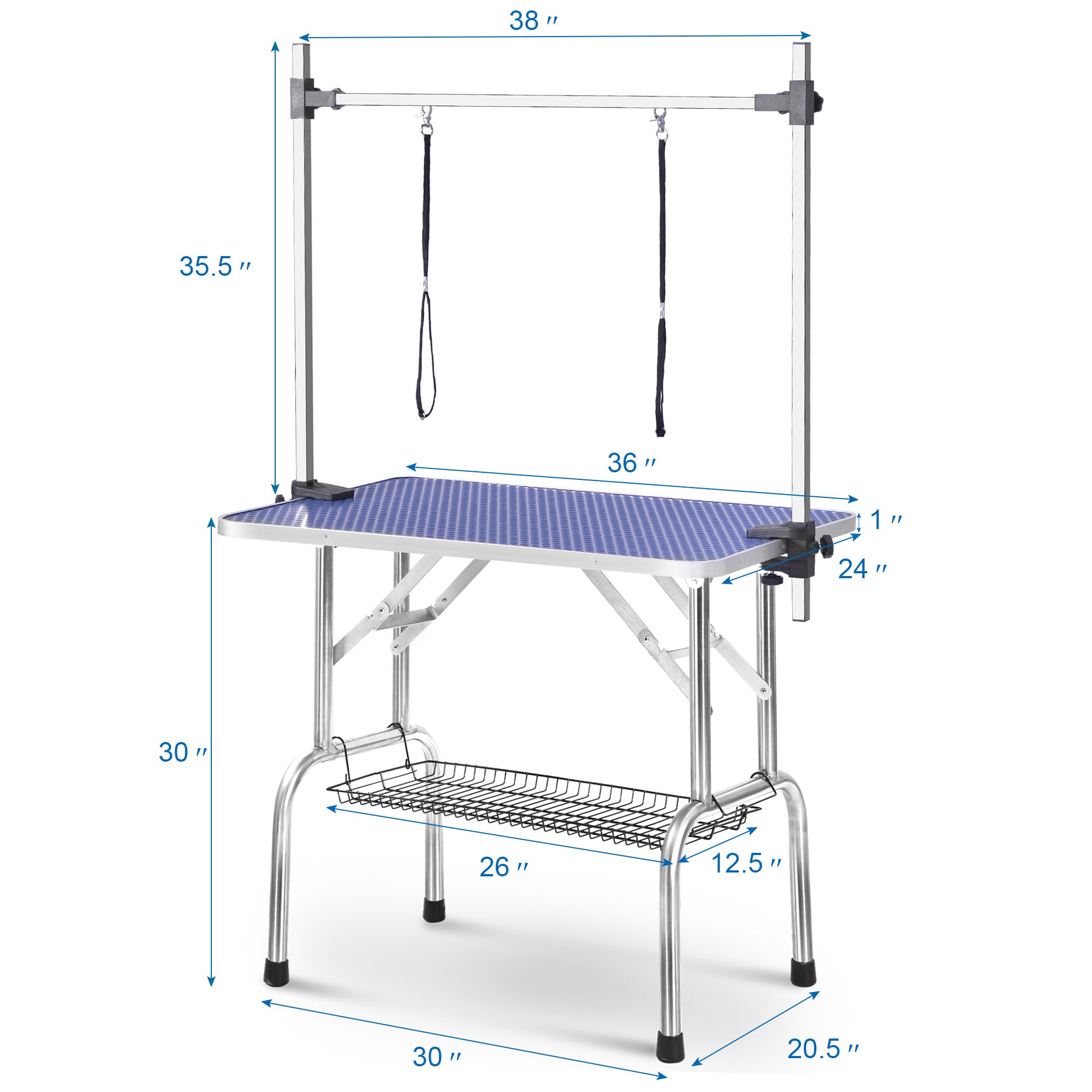 1.Solid and Durable Grooming Table:The Pet Grooming Table is made of stainless steel frame, MDF board and PVC feet pad. Table Size: 36 x 23.8 x 29.3’’ (LxWxH).Max. Weight Capacity:250-300 Lb.