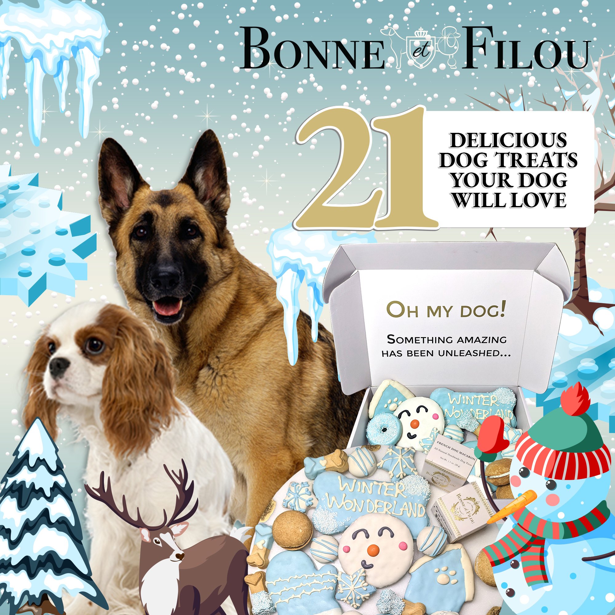 Includes 21 themed treats including snowman & snowflakes treats, winter biscuits, and dog macarons